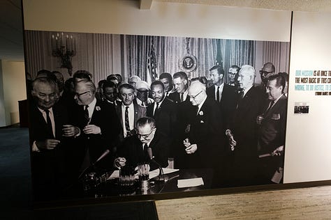 Earlier in my career, I had an experimental physicist colleague next to my office who prominently displayed a black-and-white portrait of LBJ, not Einstein or Rutherford, on his wall. I found this rather strange at the time. As an ‘excuse’, he mumbled that even though LBJ gets much flack over Vietnam, he did a lot of good; he was a complex man. After decades having lived in this country, I appreciate his sentiment and would agree with his conflicted admiration for the president. The long array of fountain pens (picture above) that LBJ used to sign numerous laws into action speaks volumes about the ‘Yang’-side of his legacy.